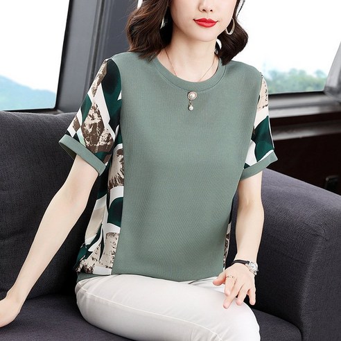 묘먀미 중년 여성용 큐빅 포인트 라운드넥 소매 패턴 반팔 티셔츠는 세련되고 편안한 스타일을 원하는 모든 여성에게 필수 아이템입니다. 이 티셔츠는 중국에서 제조되었으며, 유행을 타지 않는 엘레강트함과 캐주얼한 편안함을 훌륭하게 조화시켰습니다. 2023년 여름에 출시되어 중년 여성의 옷장에 활력을 불어넣었으며, 그린계열의 컬러로 모든 피부톤을 아름답게 보완합니다.